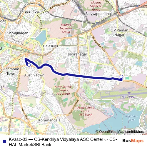 The first stop of the Kvasc-03 bus route is CS-Kendriya Vidyalaya ASC Center and the last stop is CS-HAL Market/SBI Bank. Kvasc-03 (CS-Kendriya Vidyalaya ASC Center ⇔ CS-HAL Market/SBI Bank) is operational during everyday.