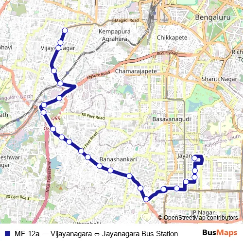 The first stop of the MF-12a bus route is Vijayanagara and the last stop is Jayanagara Bus Station. MF-12a (Vijayanagara ⇔ Jayanagara Bus Station) is operational during everyday.