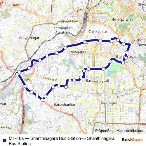 The first stop of the MF-16a bus route is Shanthinagara Bus Station and the last stop is Shanthinagara Bus Station. MF-16a (Shanthinagara Bus Station ⇔ Shanthinagara Bus Station) is operational during everyday.