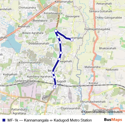 The first stop of the MF-1k bus route is Kadugodi Metro Station and the last stop is Kannamangala. MF-1k (Kannamangala ⇔ Kadugodi Metro Station) is operational during everyday.