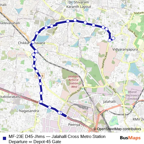Click here to view the nearest MF-23E D45-Jhms - Jalahalli Cross Metro Station Departure ⇔ Depot-45 Gate bus stop.