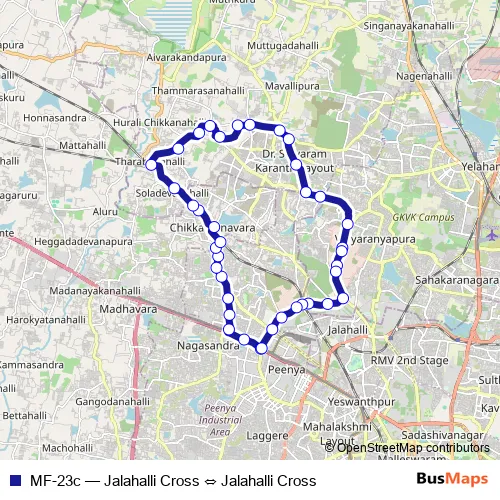 The first stop of the MF-23c bus route is Jalahalli Cross and the last stop is Jalahalli Cross. MF-23c (Jalahalli Cross ⇔ Jalahalli Cross) is operational during everyday.
