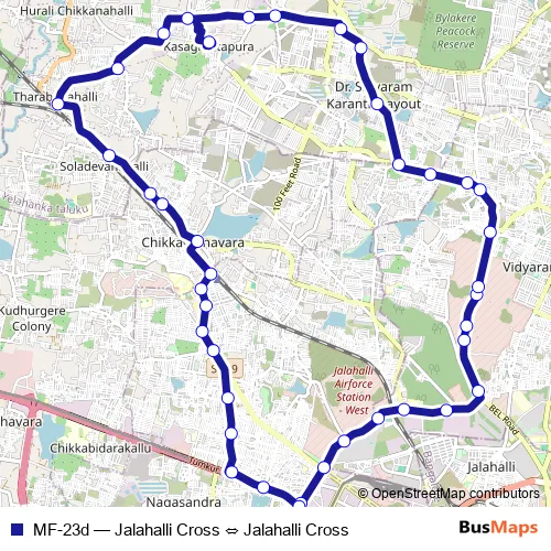 The first stop of the MF-23d bus route is Jalahalli Cross and the last stop is Jalahalli Cross. MF-23d (Jalahalli Cross ⇔ Jalahalli Cross) is operational during everyday.