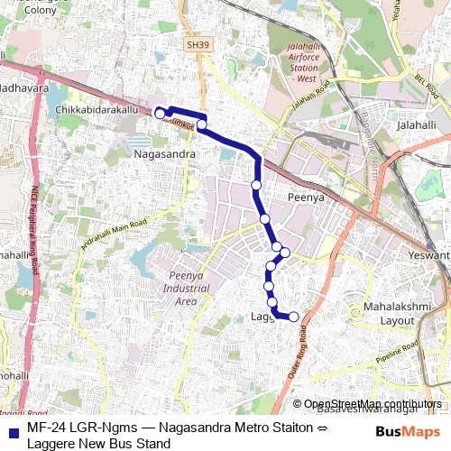 The first stop of the MF-24 LGR-Ngms bus route is Laggere New Bus Stand and the last stop is Nagasandra Metro Staiton. MF-24 LGR-Ngms (Nagasandra Metro Staiton ⇔ Laggere New Bus Stand) is operational during everyday.
