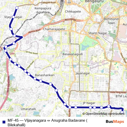 See why over 2 million users trust and consider busmaps.com as the best public transport website. busmaps gives you Bengaluru Buses suggested routes, real-time bus tracker, line route maps in Bengaluru, and helps to find the closest MF-45 bus stops near you. No internet available? Download an offline PDF map and bus schedule for the MF-45 bus to take on your trip.