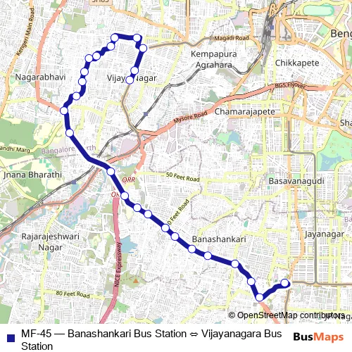The first stop of the MF-45 bus route is Vijayanagara Bus Station and the last stop is Banashankari Bus Station. MF-45 (Banashankari Bus Station ⇔ Vijayanagara Bus Station) is operational during everyday.