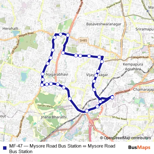 The first stop of the MF-47 bus route is Mysore Road Bus Station and the last stop is Mysore Road Bus Station. MF-47 (Mysore Road Bus Station ⇔ Mysore Road Bus Station) is operational during everyday.