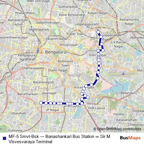 The first stop of the MF-5 Smvt-Bsk bus route is Sir M Visvesvaraya Terminal and the last stop is Banashankari Bus Station. MF-5 Smvt-Bsk (Banashankari Bus Station ⇔ Sir M Visvesvaraya Terminal) is operational during everyday.