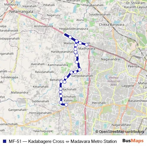 The first stop of the MF-51 bus route is Kadabagere Cross and the last stop is Madavara Metro Station. MF-51 (Kadabagere Cross ⇔ Madavara Metro Station) is operational during everyday.