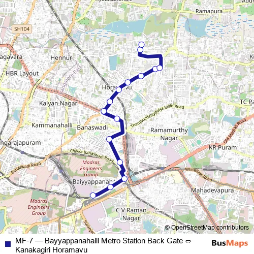 Click here to view the nearest MF-7 - Bayyappanahalli Metro Station Back Gate ⇔ Kanakagiri Horamavu bus stop.
