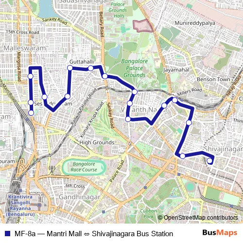 The first stop of the MF-8a bus route is Mantri Mall and the last stop is Shivajinagara Bus Station. MF-8a (Mantri Mall ⇔ Shivajinagara Bus Station) is operational during everyday.