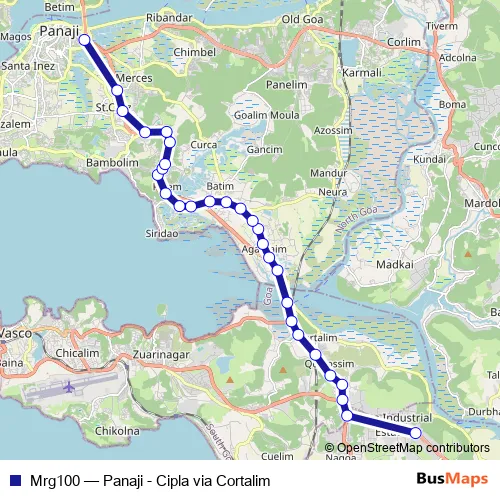 The first stop of the Mrg100 bus route is Verna Cipla and the last stop is Panaji KTC Bus Stand. Mrg100 (Panaji - Cipla via Cortalim) is operational during everyday.