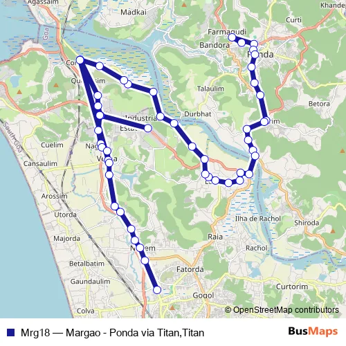 The first stop of the Mrg18 bus route is Ponda KTC Bus Stand and the last stop is Margao KTC Bus Stand. Mrg18 (Margao - Ponda via Titan,Titan) is operational during everyday.