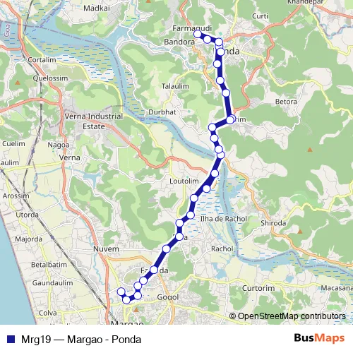 The first stop of the Mrg19 bus route is Margao KTC Bus Stand and the last stop is Ponda KTC Bus Stand. Mrg19 (Margao - Ponda) is operational during everyday.