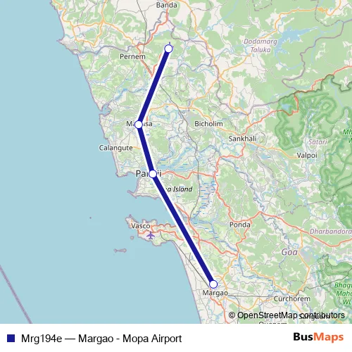The first stop of the Mrg194e bus route is Margao KTC Bus Stand and the last stop is Manohar International Airport. Mrg194e (Margao - Mopa Airport) is operational during everyday.