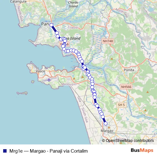 The first stop of the Mrg1e bus route is Panaji KTC Bus Stand and the last stop is Margao KTC Bus Stand. Mrg1e (Margao - Panaji via Cortalim) is operational during everyday.