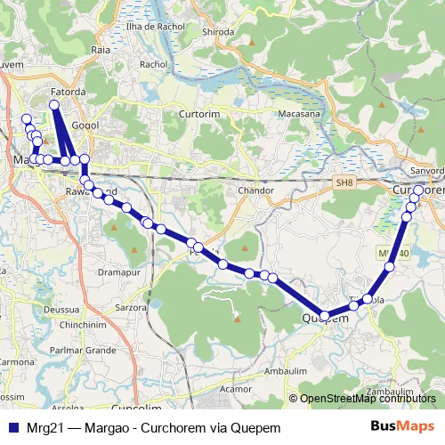 The first stop of the Mrg21 bus route is Margao KTC Bus Stand and the last stop is Curchorem - Savordem KTC Bus Stand. Mrg21 (Margao - Curchorem via Quepem) is operational during everyday.