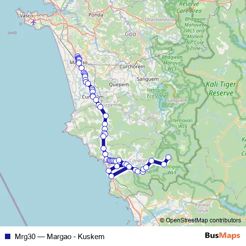 The first stop of the Mrg30 bus route is Margao KTC Bus Stand and the last stop is Kuskem. Mrg30 (Margao - Kuskem) is operational during everyday.