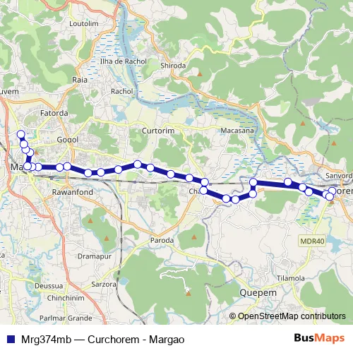 The first stop of the Mrg374mb bus route is Curchorem - Savordem KTC Bus Stand and the last stop is Margao KTC Bus Stand. Mrg374mb (Curchorem - Margao) is operational during everyday.
