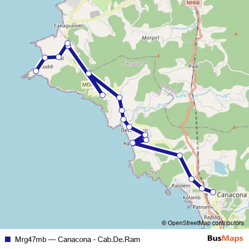The first stop of the Mrg47mb bus route is Canacona KTC Bus Stand and the last stop is Cab de Ram. Mrg47mb (Canacona - Cab.De.Ram) is operational during everyday.