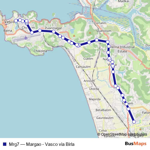 The first stop of the Mrg7 bus route is Margao KTC Bus Stand and the last stop is Vasco KTC Bus Stop. Mrg7 (Margao - Vasco via Birla) is operational during everyday.