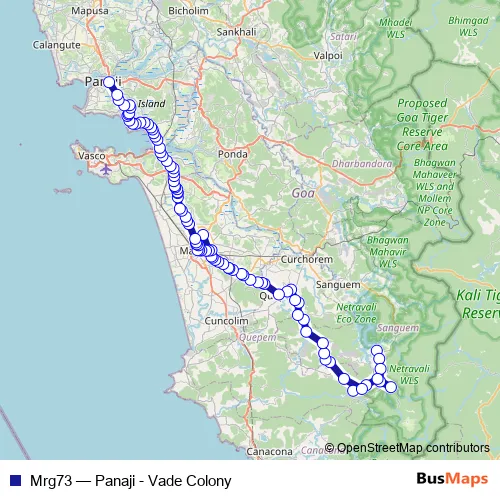 The first stop of the Mrg73 bus route is Vade Colony and the last stop is Panaji KTC Bus Stand. Mrg73 (Panaji - Vade Colony) is operational during everyday.