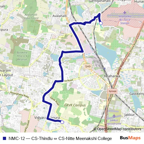 The first stop of the NMC-12 bus route is CS-Nitte Meenakshi College and the last stop is CS-Thindlu. NMC-12 (CS-Thindlu ⇔ CS-Nitte Meenakshi College) is operational during everyday.