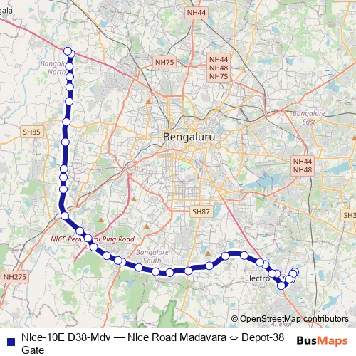 The first stop of the Nice-10E D38-Mdv bus route is Depot-38 Gate and the last stop is Madavara. Nice-10E D38-Mdv (Nice Road Madavara ⇔ Depot-38 Gate) is operational during everyday.