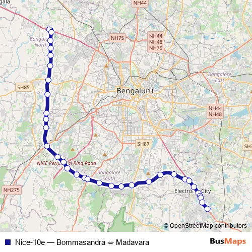 The first stop of the Nice-10e bus route is Nice Road Madavara and the last stop is Bommasandra. Nice-10e (Bommasandra ⇔ Madavara) is operational during everyday.
