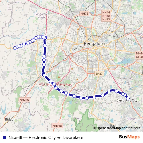The first stop of the Nice-6t bus route is Electronic City and the last stop is Tavarekere. Nice-6t (Electronic City ⇔ Tavarekere) is operational during everyday.