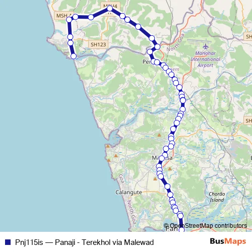 The first stop of the Pnj115is bus route is Tiracol and the last stop is Panaji KTC Bus Stand. Pnj115is (Panaji - Terekhol via Malewad) is operational during everyday.
