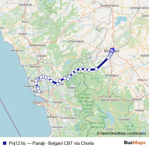 The first stop of the Pnj121is bus route is Belgavi CBT Ksrtc and the last stop is Panaji KTC Bus Stand. Pnj121is (Panaji - Belgavi CBT via Chorla) is operational during everyday.