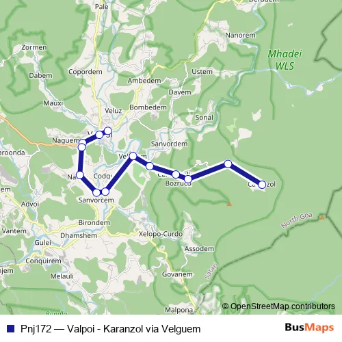 The first stop of the Pnj172 bus route is Valpoi KTC Bus Stand and the last stop is Caranzol. Pnj172 (Valpoi - Karanzol via Velguem) is operational during everyday.