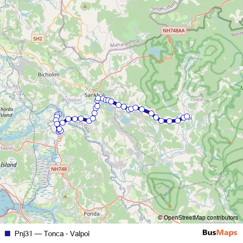 The first stop of the Pnj31 bus route is Tonca and the last stop is Valpoi KTC Bus Stand. Pnj31 (Tonca - Valpoi) is operational during everyday.