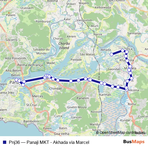 Services on the Pnj36 - Panaji MKT - Akhada via Marcel bus stop at 21:50 on Monday, Tuesday, Wednesday, Thursday, Friday, Saturday, Sunday.