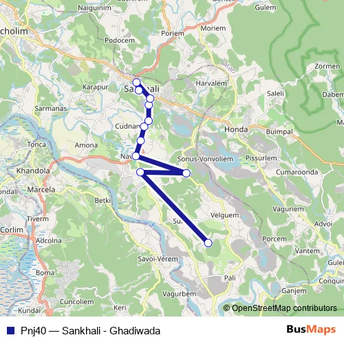 The first stop of the Pnj40 bus route is Surla and the last stop is Sankhali KTC Bus Stand. Pnj40 (Sankhali - Ghadiwada) is operational during everyday.