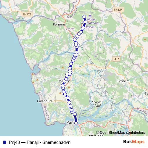 The first stop of the Pnj48 bus route is Panaji KTC Bus Stand and the last stop is Shemechya Advan. Pnj48 (Panaji - Shemechadvn) is operational during everyday.