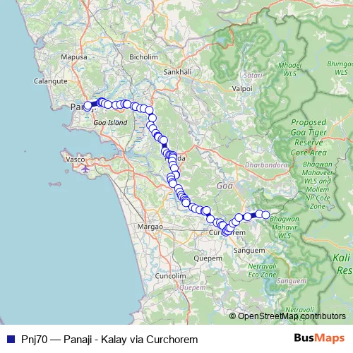 The first stop of the Pnj70 bus route is Panaji KTC Bus Stand and the last stop is Kalay. Pnj70 (Panaji - Kalay via Curchorem) is operational during everyday.