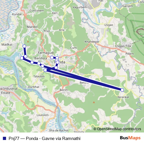 The first stop of the Pnj77 bus route is Ponda KTC Bus Stand and the last stop is Gaune. Pnj77 (Ponda - Gavne via Ramnathi) is operational during everyday.