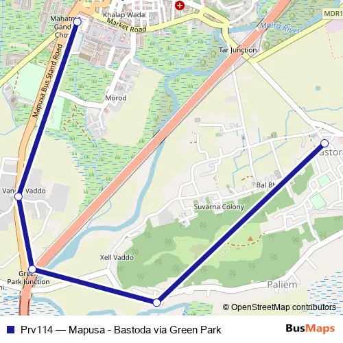 The first stop of the Prv114 bus route is Mapusa KTC Bus Stand and the last stop is Bastora. Prv114 (Mapusa - Bastoda via Green Park) is operational during everyday.