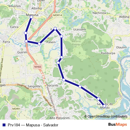 The first stop of the Prv184 bus route is Salvador and the last stop is Mapusa KTC Bus Stand. Prv184 (Mapusa - Salvador) is operational during everyday.