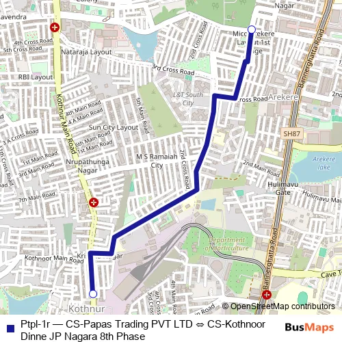 The first stop of the Ptpl-1r bus route is CS-Kothnoor Dinne JP Nagara 8th Phase and the last stop is CS-Papas Trading PVT Ltd. Ptpl-1r (CS-Papas Trading PVT LTD ⇔ CS-Kothnoor Dinne JP Nagara 8th Phase) is operational during everyday.