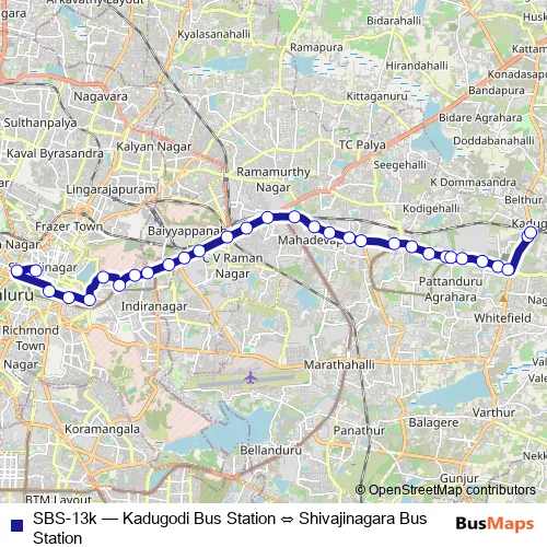 The first stop of the SBS-13k bus route is Shivajinagara Bus Station and the last stop is Kadugodi Bus Station. SBS-13k (Kadugodi Bus Station ⇔ Shivajinagara Bus Station) is operational during everyday.