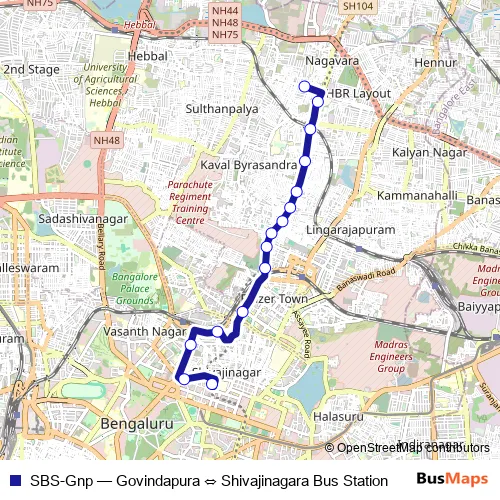 Bus SBS-Gnp - Govindapura ⇔ Shivajinagara Bus Station in Bengaluru: Stops & Timetable