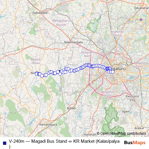 The first stop of the V-240m bus route is Magadi Bus Stand and the last stop is KR Market (Kalasipalya). V-240m (Magadi Bus Stand ⇔ KR Market (Kalasipalya)) is operational during everyday.