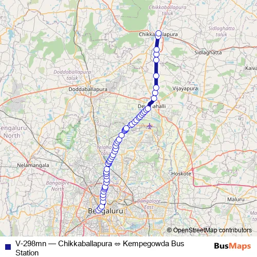 The first stop of the V-298mn bus route is Kempegowda Bus Station and the last stop is Chikkaballapura. V-298mn (Chikkaballapura ⇔ Kempegowda Bus Station) is operational during everyday.