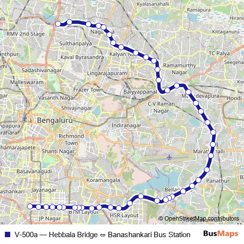 See why over 2 million users trust and consider busmaps.com as the best public transport website. busmaps gives you Bengaluru Buses suggested routes, real-time bus tracker, line route maps in Bengaluru, and helps to find the closest V-500a bus stops near you. No internet available? Download an offline PDF map and bus schedule for the V-500a bus to take on your trip.