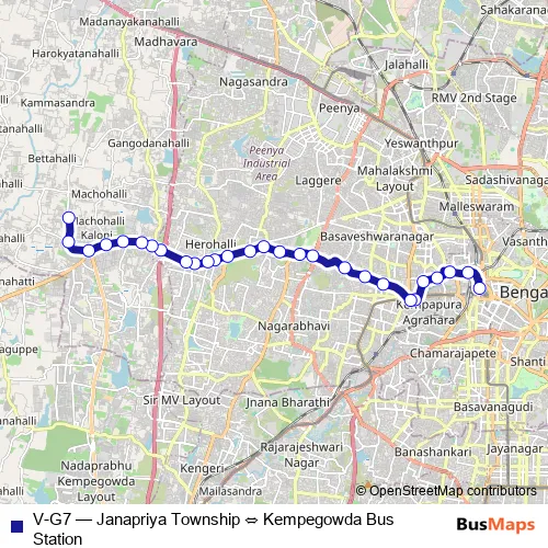 The first stop of the V-G7 bus route is Kempegowda Bus Station and the last stop is Janapriya Township. V-G7 (Janapriya Township ⇔ Kempegowda Bus Station) is operational during everyday.