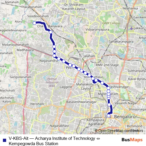 The first stop of the V-KBS-Ait bus route is Kempegowda Bus Station and the last stop is Acharya Institute of Technology. V-KBS-Ait (Acharya Institute of Technology ⇔ Kempegowda Bus Station) is operational during everyday.