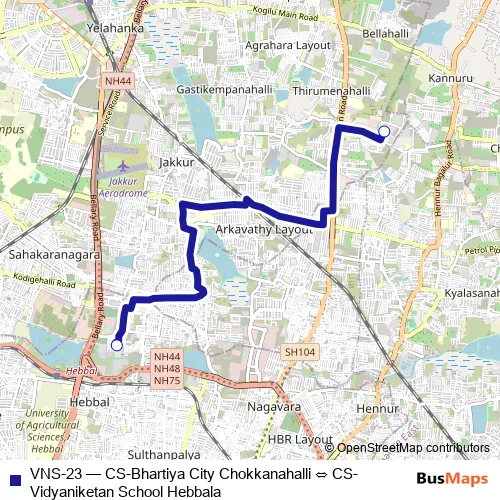 The first stop of the VNS-23 bus route is CS-Bhartiya City Chokkanahalli and the last stop is CS-Vidyaniketan School Hebbala. VNS-23 (CS-Bhartiya City Chokkanahalli ⇔ CS-Vidyaniketan School Hebbala) is operational during everyday.